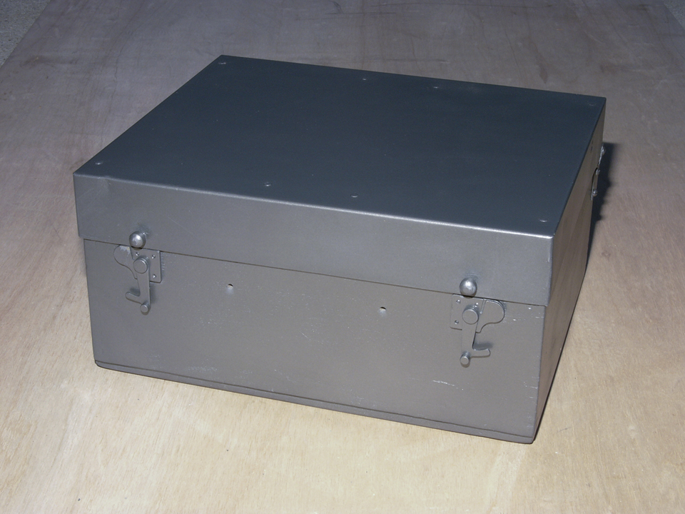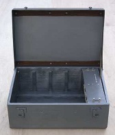 consists of two pieces, the standard five coil wooden box and a hinged steel lid. The