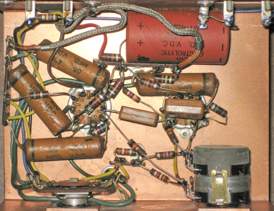 The unit had four 0.05 uF 400 V wax paper capacitors and one 25 uF 450V